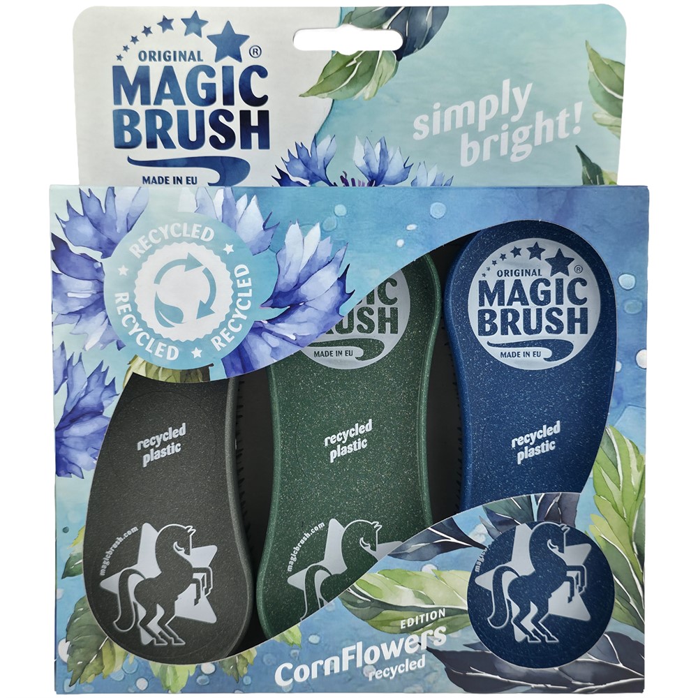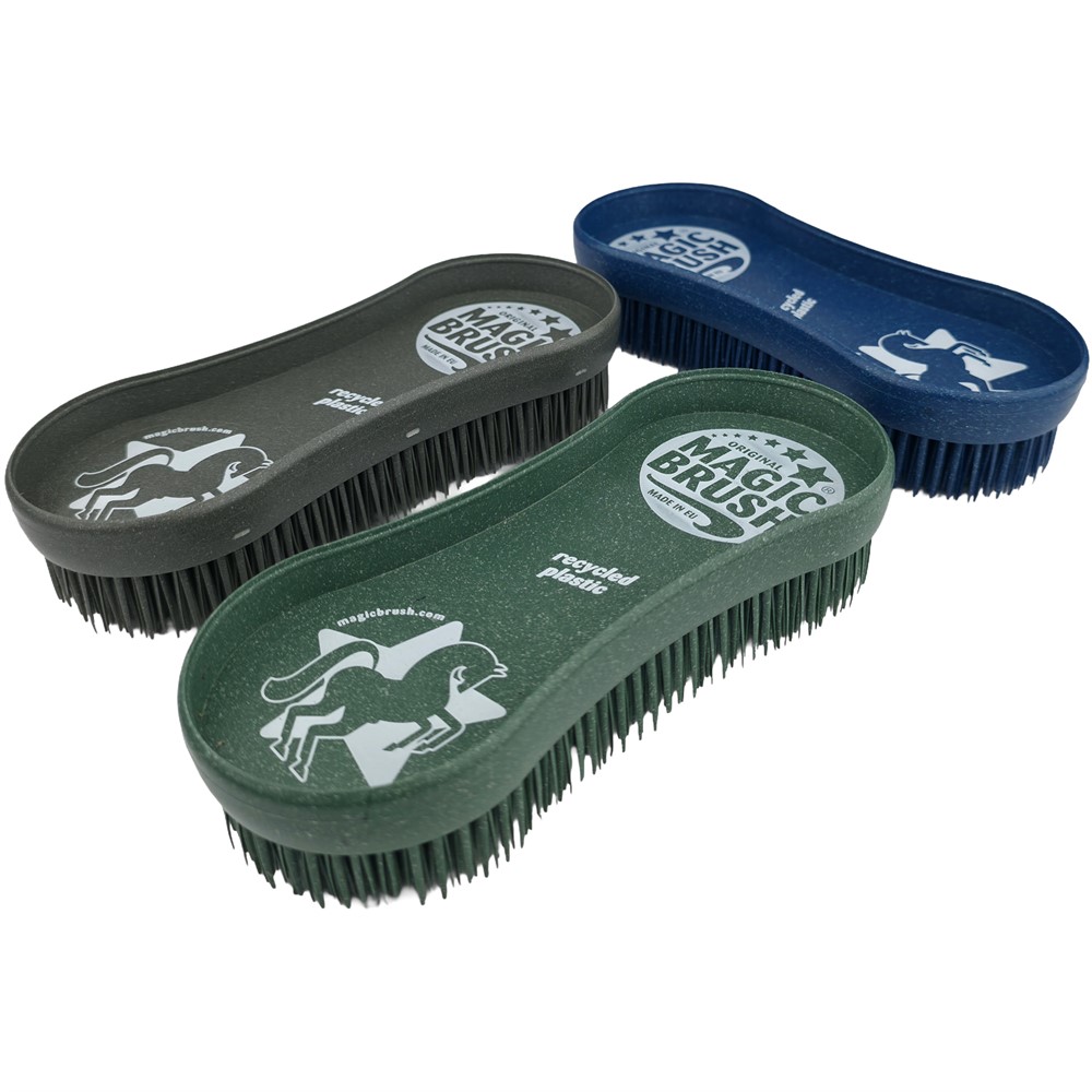 Set med 3 stycken ryktborstar som genom sin speciella struktur och form både rengör och masserar hästen samtidigt. Borstarna kan maskintvättas vid behov. Ryggen av borsten kan användas som svettskrapa.