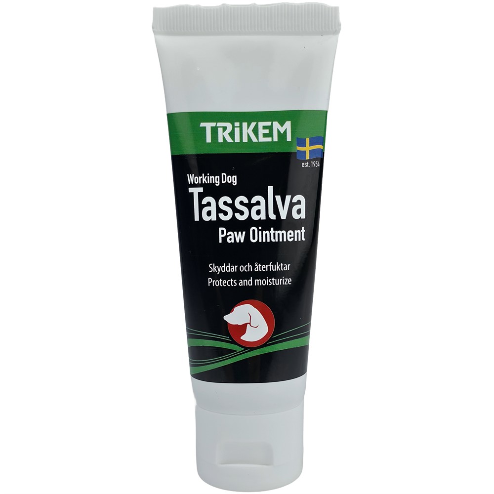 En fet tassalva som ger skydd och verkar mjukgörande för hundens trampdynor. Salvan innehåller ullfett, bivax och Tea tree som verkar milt antiseptiskt och vårdar tassen. Trikems Tassalva innehåller inga koncentrationer som är farliga för hunden. Genom att hålla hundens trampdynor mjuka, förbygger du sprickor och ger ett ökat skydd mot väta, salt, smuts och het asfalt.