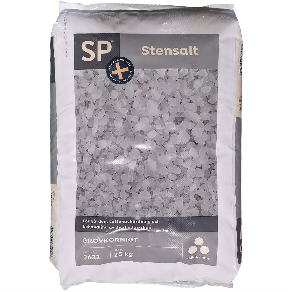 Stensalt används till att salta hö och har en konserverande och dammhämmande effekt. Dosera ungefär 6-7 kg salt per ton hö. Stensalt kan även användas till vanlig halkbekämpning under vintern. SP Stensalt är ett högkvalitativt grovt salt som är tillverkat av selekterat stensalt. Kornstorleken är 0,8 mm - 3,2 mm.