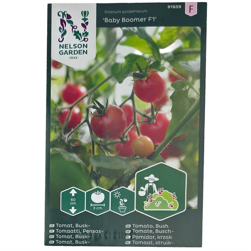 Busktomat 'Baby Boomer' F1 producerar många, över 300, välsmakande saftiga och röda körsbärstomater på en säsong. Plantan blir 60 centimeter hög och ungefär lika bred. Den har ett kraftfullt och starkt växtsätt. Tomaterna må vara små (3 centimeter i diameter) men de har en stor smak.