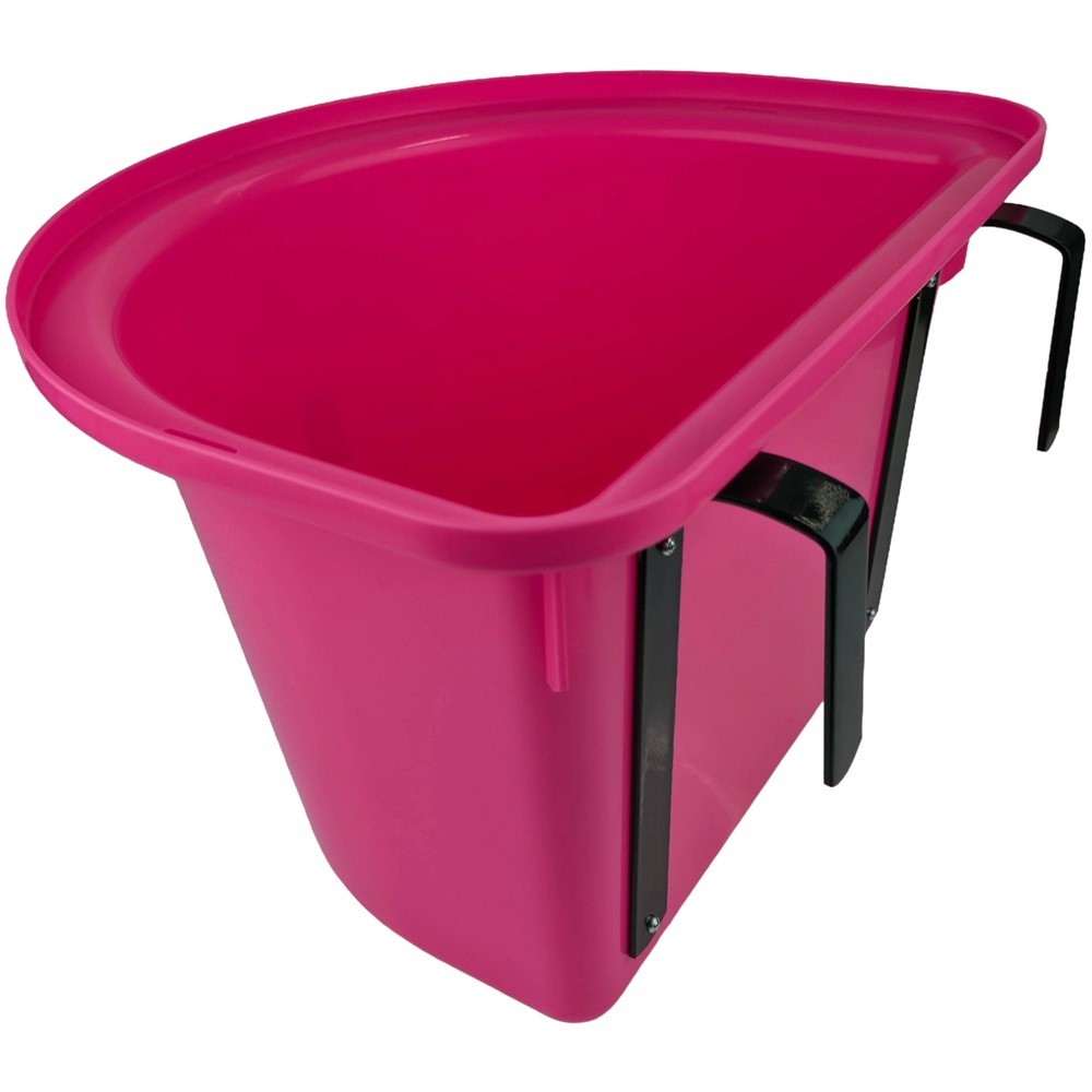 Rosa transportkrubba med platt baksida och 2 metalbyglar som gör att man lätt kan hänga upp den på ex. boxväggen eller liknande. Smidig att ha med vid exempelvis resor eller tävlingar.