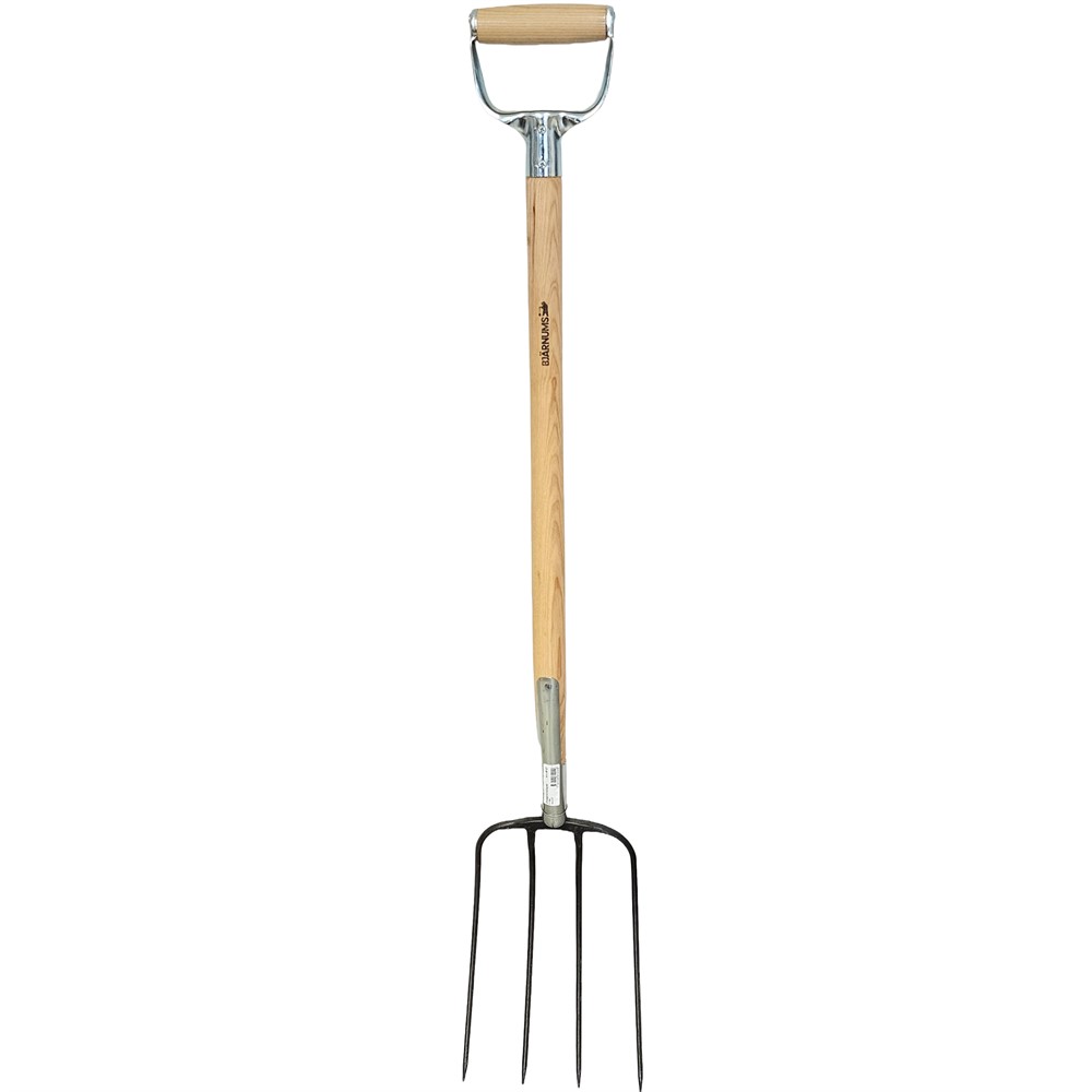 En rejäl gödselgrep med 4 horn och linoljat träskaft i ask. Grephuvudet har helsmidda stålhorn. Skaftet är försett med D-handtag.