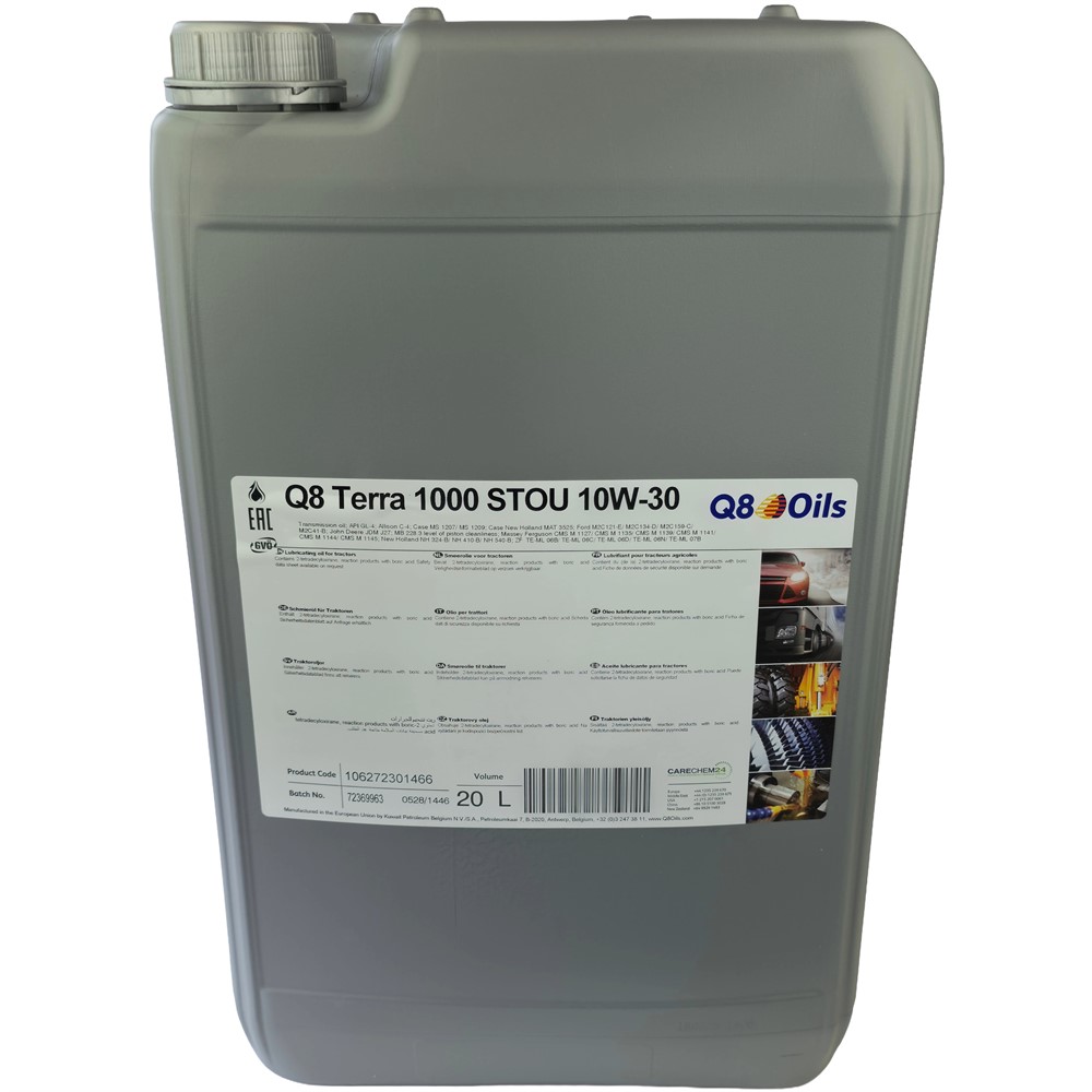 Q8 Terra 1000 STOU 10W-30 är en kombinerad motor-, transmissions- och hydraulolja av STOU-typ. Avsedd för diesel- och bensinmotorer. Speciellt anpassad för transmissioner med våta bromsar. Universalolja för lantbrukare och entreprenörer. Q8 Terra 1000 STOU 10W-30 uppfyller kraven från API, ACEA och flera OEM.