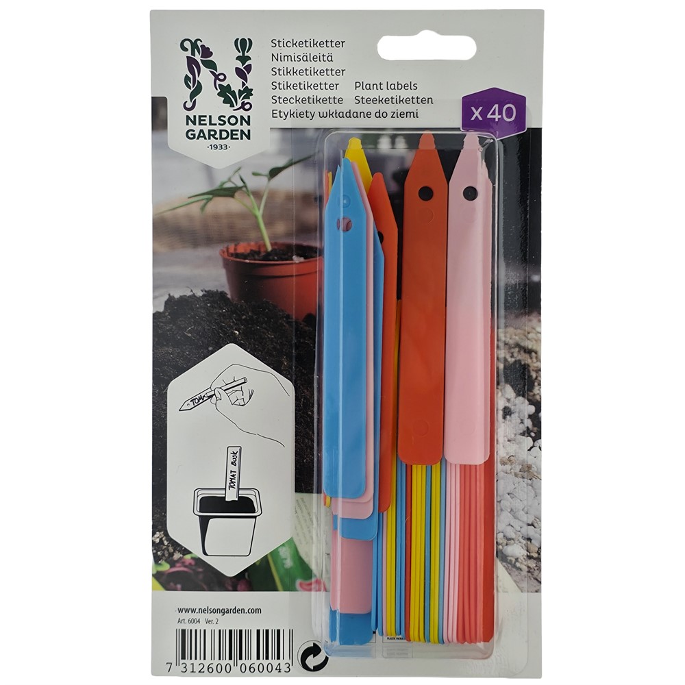 Sticketiketter i plast för märkning av planteringar. Fyra olika färger för bättre struktur och översikt.