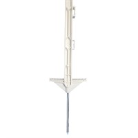 Plaststolpe med stålspets och dubbelt stöd för att trampa ned stolpen i backen. Längd ovan mark är 85 cm och 10 stycken fasta isolatorer varav 7 stycken för band och 3 stycken för rep.
