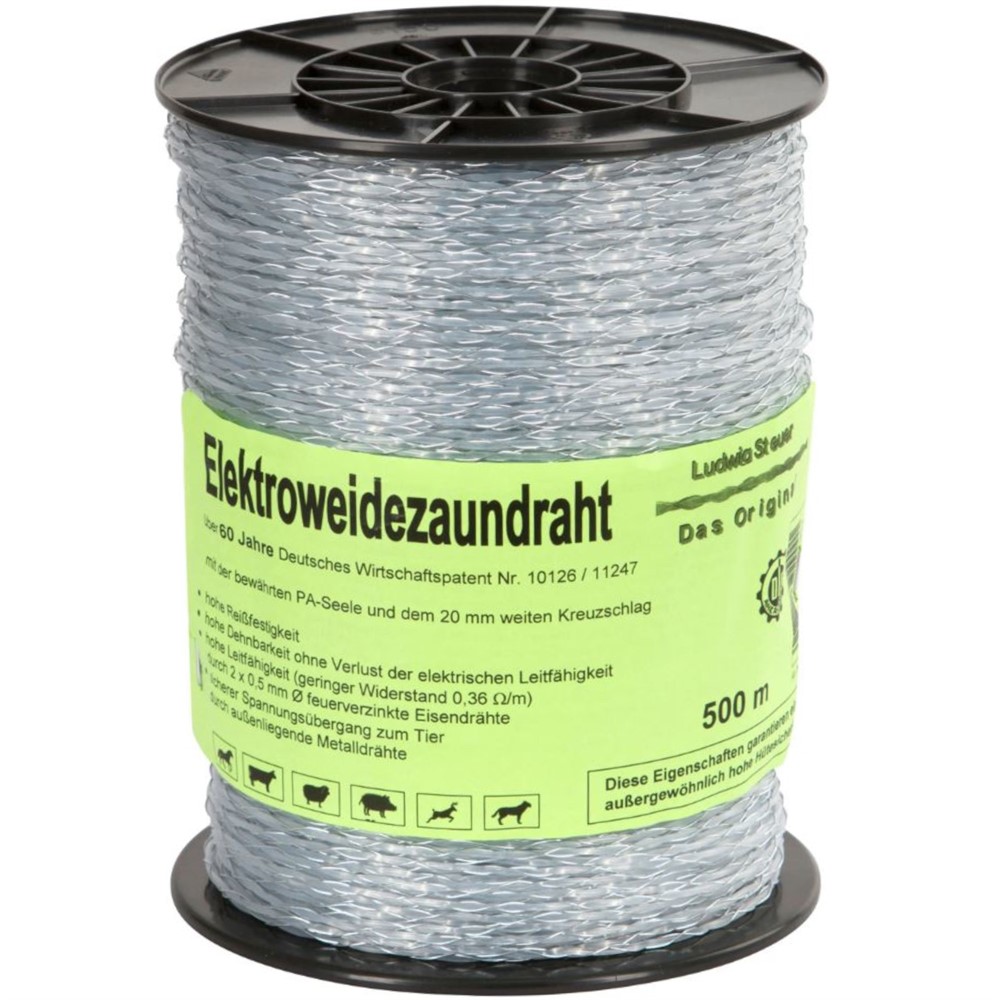 Eltråd med 2 stycken galvaniseraded metalltrådar (0,5 mm) som är tvinnade runt en polytråd. Förpackning med 500 meter.