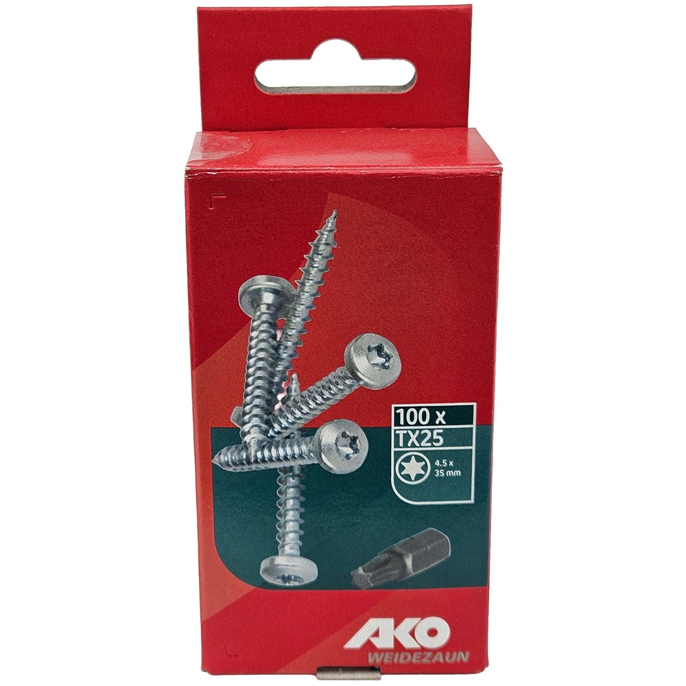 Träskruv till isolator. Mått 4,5 x 35 mm. Levereras i förpackning med 100 stycken skruv och passande torx (TX25).